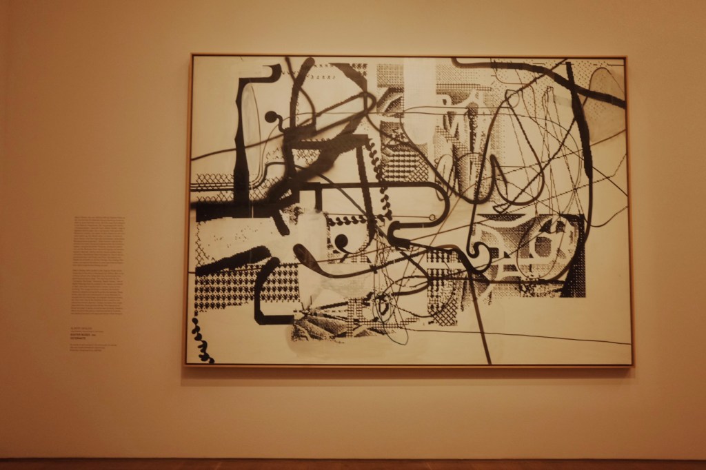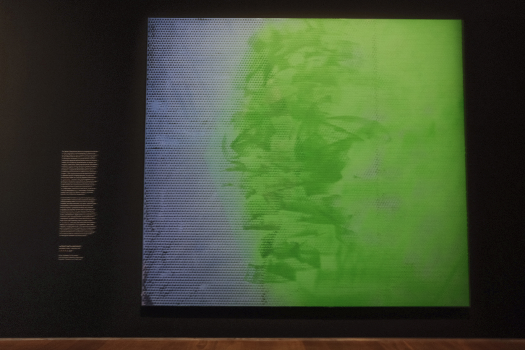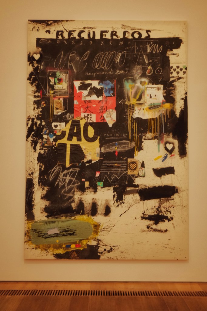 To the left, a pair of continuous ticking counters that omit the number “0” (Opposite Harmony, Tatsuo Miyajima) symbolizing Buddhist ideas of impermanence, and to the right juxtaposed with Raymond Saunders’ Recuerdos, Not in the Chair (which reminded me of walking down a busy street in New York City, with all of the mess and grime).