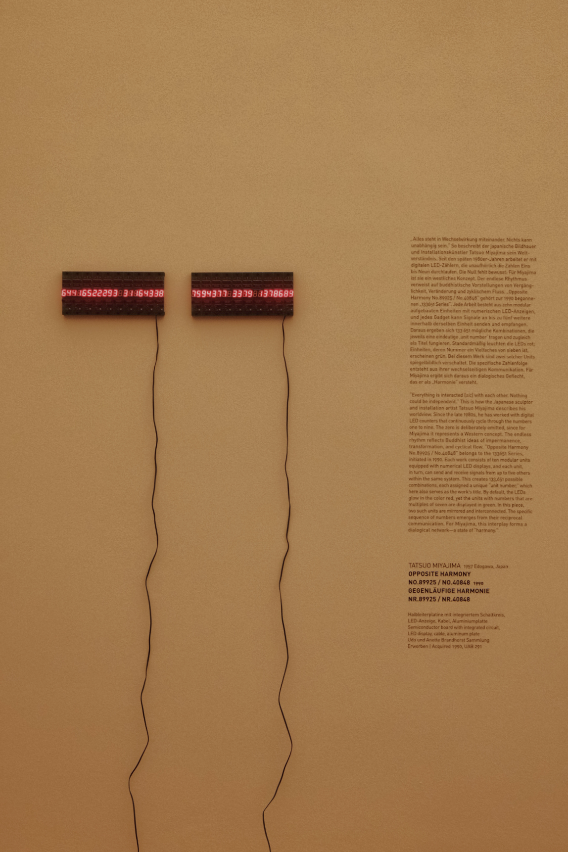 To the left, a pair of continuous ticking counters that omit the number “0” (Opposite Harmony, Tatsuo Miyajima) symbolizing Buddhist ideas of impermanence, and to the right juxtaposed with Raymond Saunders’ Recuerdos, Not in the Chair (which reminded me of walking down a busy street in New York City, with all of the mess and grime).